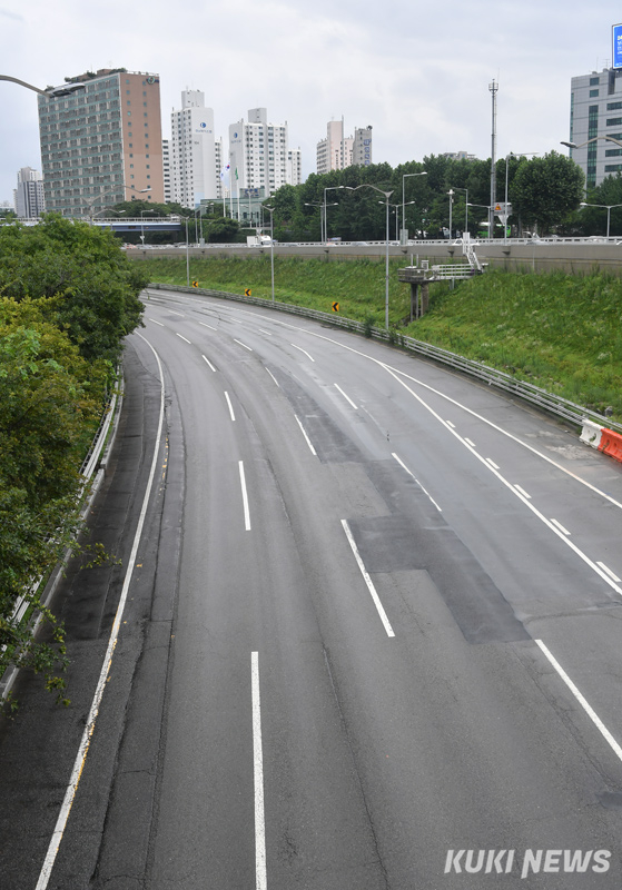 [쿠키뉴스] 박효상 기자 = 서울과 경기에 집중호우가 계속된 3일 오후 팔당댐 방류 영향으로 한강 수위가 상승되어 올림픽대로 일부 구간이 통제됐다. 사진은 여의도 서울교 위에서 본 올림픽대로.