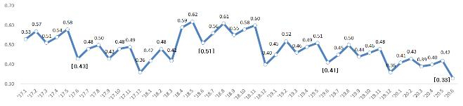 은행 대출 연체율은 올해들어 4% 언저리에서 등락을 보여왔다. 지난해 12월말 0.36% 였던 연체율은 2월말 0.43%까지 올라갔으나 3월말 0.39%로 하락했다. 이후 상승세로 전환한 연체율은 5월말 0.42%까지 상승한 후 6월말 0.33%까지 급락했다.
