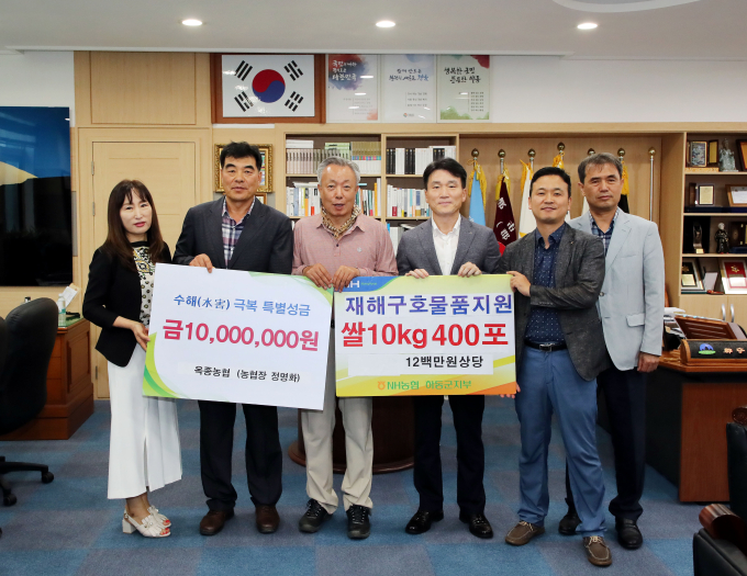 그리고 엔젤드론교육원(원장 이진성)이 2ℓ들이 생수 1200병, 형제식육식당(대표 한광열)이 밥 300인분, 농협중앙회 경남본부(본부장 윤해진)가 침수지역 복구를 위해 1000만원 상당의 양수기 20대를 지원했다.
