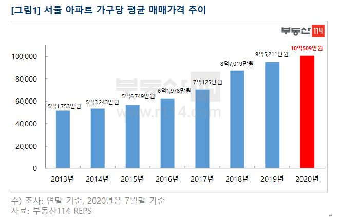 12일 부동산114에 따르면 7월말 기준 서울 아파트의 가구(호)당 평균 매매가격은 10억509만원을 기록했다, 2013년 5억원 초반에 머물던 평균 매매가격이 7년 만에 2배가량 뛴 수준이다.