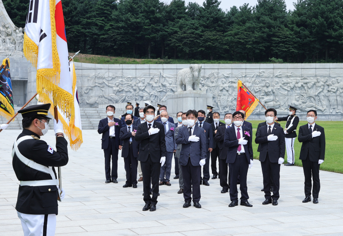 ▲광복절 대전 현충원 참배 [대전=쿠키뉴스] 명정삼 기자 = 허태정 시장은 15일 열린 제75주년 광복절 경축사를 통해 "오늘날 우리가 이처럼 발전을 지속할 수 있었던 것은 바로 독립운동에 그 뿌리가 있다"면서 " 독립유공자와 국가유공자들이 자긍심을 가질 수 있도록 예우에 최선을 다하겠다"고 말했다.