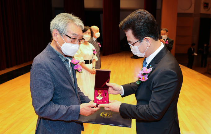 ▲광복절 기념식에서 허태정 대전시장이 유공자 정부포상을 하고 있다. 또한 허태정 시장은 대전이 중부권 대표 도시로써 충청권의 발전을 이끌고 있고 대전의 발전은 여기서 멈추지 않을 것이라고 강조했다.