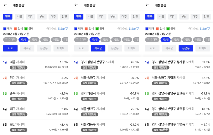 시구군별로 보면 경기 성남시가 45.5%(5700건→3100건), 서울 송파구 30.9%(7800건→5400건), 경기 과천시 30.8%(890건→620건), 서울 양천구 25.9%(3800건→2800건), 서울 강동구 21.2%(5900건→4700건), 서울 서초구 21.2%(1만2000건→1만건), 서울 강남구 21.0%(1만5000건→1만2000건)의 매물 감소율을 기록했다.