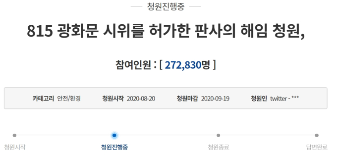 24일 청와대 국민청원 게시판에 따르면 이달 20일 올라온 '8·15 광화문 시위를 허가한 판사(서울행정법원 행정11부 박형순 부장판사)의 해임' 청원 글은 현재 9시 30분 기준으로 27만2830명의 동의를 얻었다.
