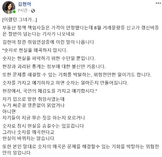 이어 “김현미 장관 취임 연설 중에 이런 말이 나온다. ‘숫자로 현실을 왜곡하지 맙시다’. 숫자는 현실을 파악하기 위한 수단일 뿐, 현장과 괴리된 통계는 정부에 대한 불신만 키운다”고 지적했다.