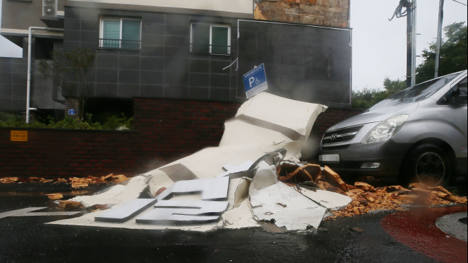 태풍의 영향을 받고 있는 제주에서는 신호등이 떨어지거나 가로등이 꺾이는 등의 피해가 속출했다. 가로수가 꺾이고 가게 유리창이 깨졌다.