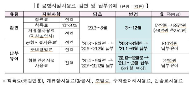 지상조업사의 구내 영업료, 항공사 계류장 사용료, 한국 공역 내 운항 항공기에 징수하는 항행 안전시설 사용료 등에 대한 납부유예 조치도 4개월 연장된다.