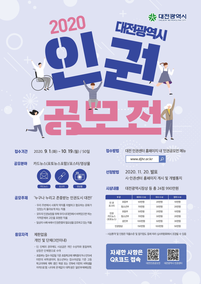 [대전=쿠키뉴스] 명정삼 기자 = 대전시는 인권존중 문화 확산을 위해 ‘2020년 대전광역시 인권공모전’(이하 공모전)을 개최한다고 31일 밝혔다.