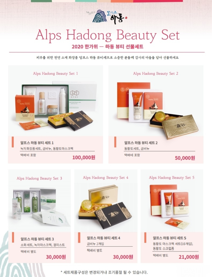 경남 하동군(군수 윤상기)이 올해 추석을 맞아 하동 농·특산물을 담은 프리미엄 기프트세트와 천연 소재 화장품으로 구성된 알프스 하동 뷰티세트를 마련해 알프스푸드마켓에서 주문 접수해 판매하고 있다.