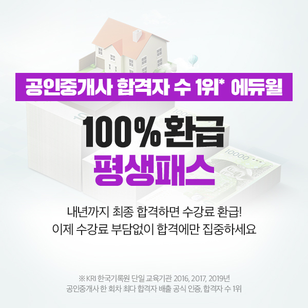 [쿠키뉴스] 김영보 기자 = 종합교육기업 에듀윌(대표 박명규)은 공인중개사 자격증 시험에 합격하면 수강료를 돌려주는 ‘100% 환급 평생패스’를 출시한다고 2일 밝혔다.