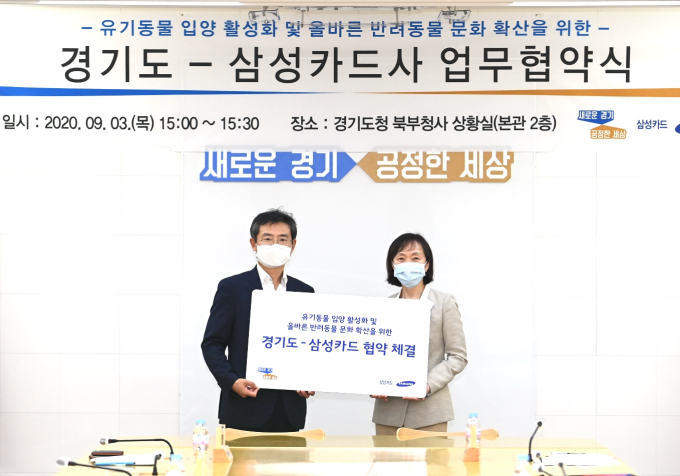 이용철 경기도 행정2부지사와 이인재 삼성카드 부사장은 3일 경기도청 북부청사에서 이 같은 내용을 담은 '유기동물 입양 활성화와 올바른 반려동물 문화 확산을 위한 경기도-삼성카드 협약서'에 공동 서명했다.