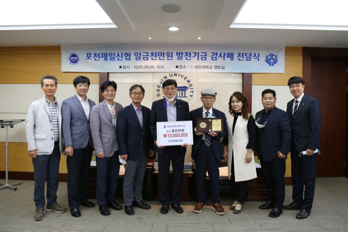 전달식에는 임영문 대진대 총장과 교무위원, 정희진 포천제일신협 이사장과 김윤희 전무, 최병욱 지점장 등이 참석했다.