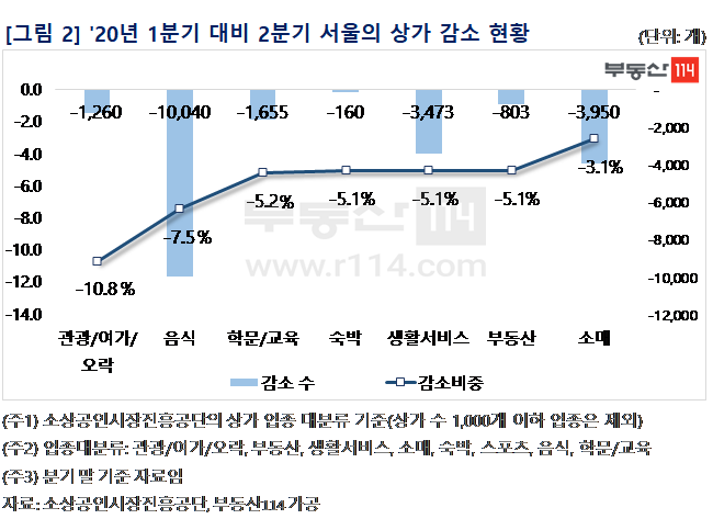 부동산114는 서울의 상가 감소 추세가 3분기에도 이어갈 것으로 전망했다. 8월 중순 이후 코로나 재확산에 따라 다중이용시설의 운영이 한시적으로 중단되거나 제한돼, 매출에 타격이 불가피해졌기 때문이다.