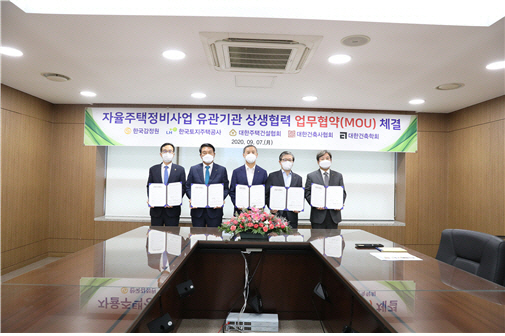 한국감정원이 한국토지주택공사(LH), 대한주택건설협회, 대한건축사협회, 대한건축학회와 자율주택정비사업 활성화를 위한 업무협약(MOU)을 체결했다고 밝혔다.