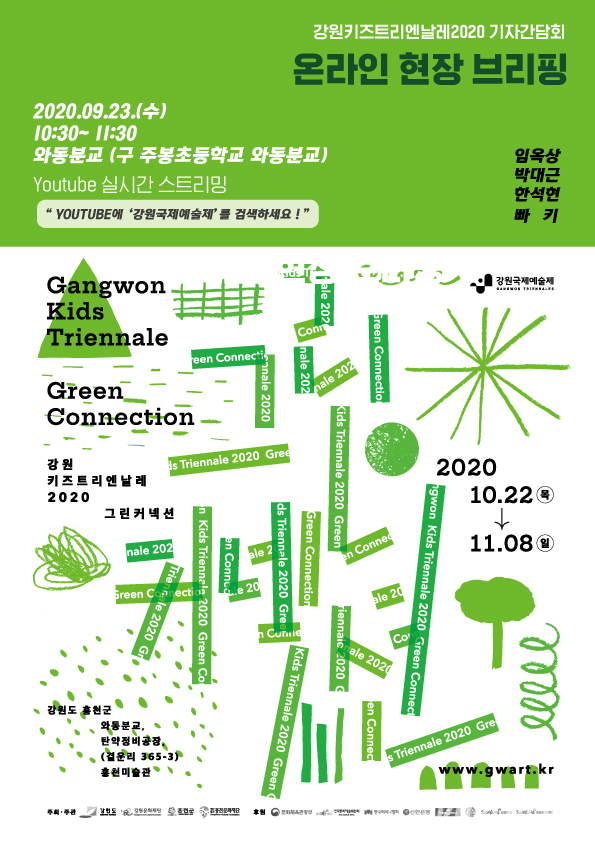 [춘천=쿠키뉴스] 하중천 기자 = (재)강원문화재단(대표이사 김필국)은 오는 9월23일 홍천군 와동분교에서 온라인 실시간 방송으로 ‘강원키즈트리엔날레2020’ 현장 브리핑을 진행한다고 21일 밝혔다.