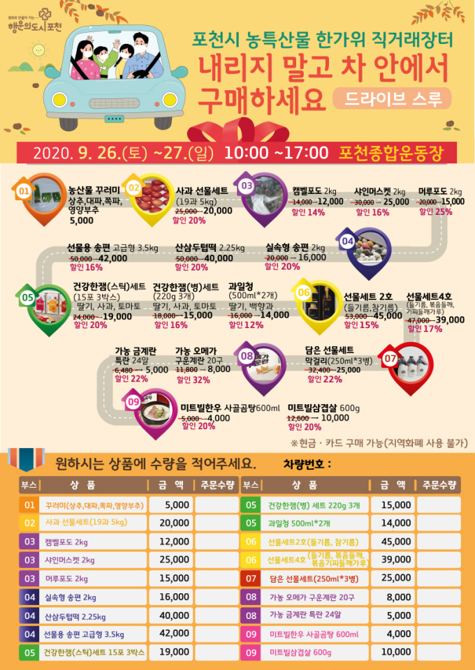 행사는 오전 10시부터 오후 5시까지 열리며, 차량을 타고 행사장 안내소에서 주문서를 받아 구매하고 싶은 직거래 부스에서 차량에서 내리지 않고 현금 또는 카드로 구매할 수 있다.