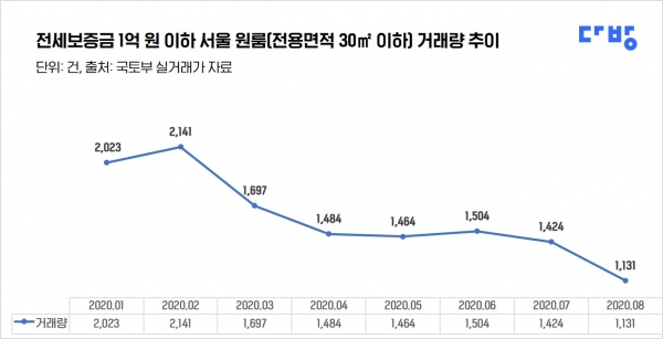다방 관계자는 “코로나19 사태 장기화와 임대차 2법 시행에 따라 임대 시장 불안정성이 심화되면서 지난 7월부터 2개월 연속 서울 원룸 전·월세 거래가 감소했다”며 “전세보증금이 점차 오르면서 서울 전세보증금 1억 원 이하 원룸 거래도 7월부터 하락 전환됐다”고 말했다.
