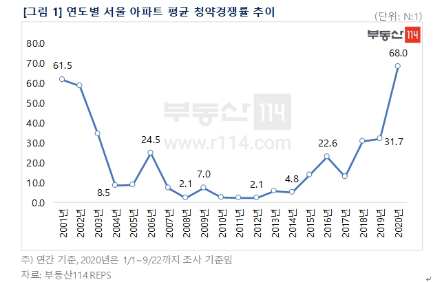 부동산114에 따르면 올해 9월까지 서울의 아파트 평균 청약경쟁률은 68대 1을 기록했다. 이는 조사가 시작된 2002년 이후 가장 높은 경쟁률이다.