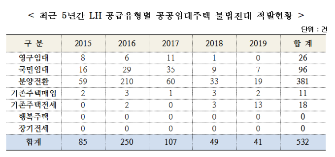 더불어민주당 정정순 의원(국토교통위원회)이 LH로부터 제출받은 자료에 따르면 LH는 최근 5년간 ▲2015년 85건 ▲2016년 250건 ▲2017년 107건 ▲ 2018년 49건 ▲2019년 41건 등 총 532건의 임대주택 불법 전대를 적발했다.
