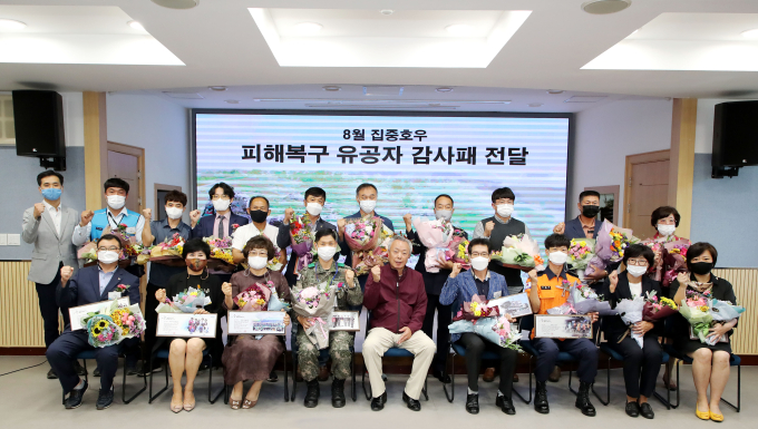 [하동=쿠키뉴스] 강연만 기자 = 경남 하동군(군수 윤상기)이 지난 28일 군청 소회의실에서 집중호우 피해 복구를 위해 가장 먼저 자발적으로 달려와 헌신적으로 봉사해준 군부대·단체·개인 등 25명에게 감사패를 전달했다.