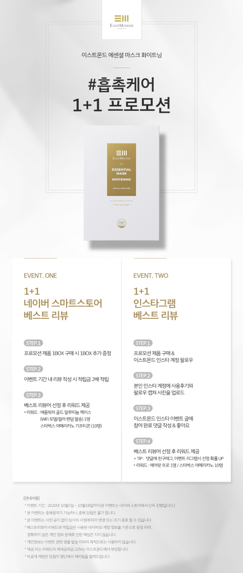 [쿠키뉴스] 김영보 기자 = 코스메슈티컬 브랜드 이스트몬드는 기능성 마스크팩 '에센셜 마스크 화이트닝(흡촉케어팩)' 네이버 스마트스토어 입점을 기념해 오늘(5일)부터 18일까지 1+1 이벤트를 실시한다고 밝혔다.