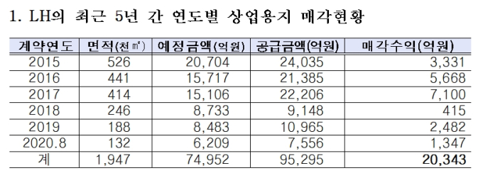 LH가 5년간 판매한 상업용지의 총 면적은 1947천㎡(약 59만평) 규모였으며, 감정평가 등에 따라 책정된 공급예정액은 7조4952억원으로 집계됐다.