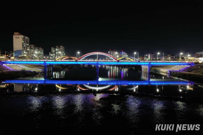 [홍천=쿠키뉴스] 하중천 기자 =강원 홍천군(군수 허필홍)이 홍천강 경관프로젝트의 일환으로 화양교 경관조명을 새 단장했다. LED 파노라마 조명등을 이용해 다채로운 빛의 변화로 4계절 분위기를 연출했다. (홍천군 제공) 2020.10.7.