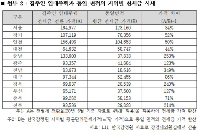 지역별 가격 차이를 살펴보기 위해 LH의 집주인 임대주택 전세금 환산 가격과 한국감정원 자료로 산출한 같은 지역의 동일 면적 전세금 가격을 비교하였더니 전국 모든 지역에서 집주인 임대주택의 전세금이 더 높은 수준으로 나타났다.