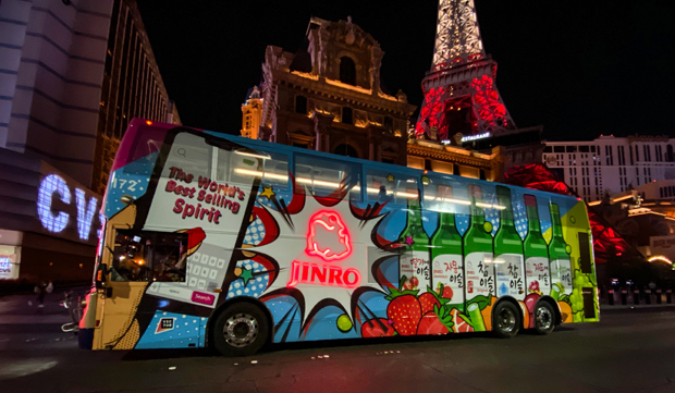 랩핑버스는 참이슬과 자몽에이슬, 자두에이슬 등의 주요 제품과 함께 알록달록한 과일들이 만화형식으로 디자인돼 멀리서도 진로 소주가 한눈에 부각된다. 라스베이거스 특유의 화려한 거리 풍경과 어울리는 일루미네이션을 활용해 세계에서 가장 많이 팔린 증류주 ‘진로’와 상징인 ‘두꺼비’를 알리는데 중점을 뒀다.