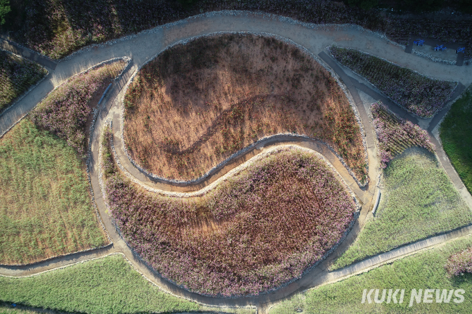 인근 금학산에서 내려다 본 남노일리 마을은 자연적 하전과 강이 만들어 놓은 태극문양 마을로 지난해부터 군이 대규모 꽃밭을 조성해 왔다.