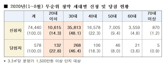 당첨자 또한 30대와 20대가 가장 많았다. 12개 단지의 무순위 청약 당첨자 578명 중 268명(46.4%)이 30대였다. 20대 이하는 132명(22.8%)으로 40대(18.3%)나 50대(8.0%)를 앞질렀다.