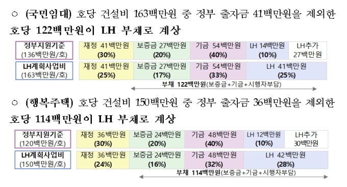 행복주택은 1채당 1억1400만원, 영구임대주택도 1채당 3600만원을 LH가 부담해야 한다. 매입임대의 경우 9100만원이 빚으로 남는다.