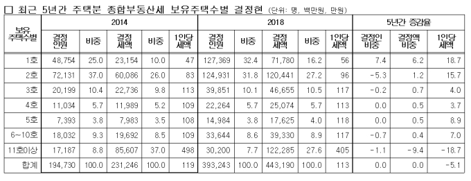 여기에 5년간 보유 주택수별 납부자 변동 비율을 보면 1주택자만 7.4%나 증가했고, 결정세액도 6.2% 늘었으며, 1인당 세액도 18.7%나 급증했다.