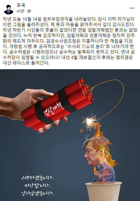 첨부한 그림은 조 전 장관의 모습을 한 촛불로 검찰개혁이란 글씨가 쓰인 마이너마이트에 불을 붙이는 모습으로, '고생하셨습니다. 미안합니다. 잊지 않겠습니다'라는 문구가 적혀있다.