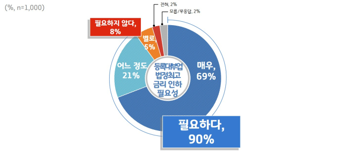 이를 뒷받침하듯 현행 연 24%인 등록 대부업의 법정 최고금리 수준에 대해서는 '높은 편'이라는 인식이 92%를 차지했다. '낮은 편이다'와 '적정 수준이다'는 각각 4%에 불과했다.
