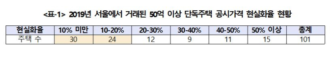 분석에 따르면 특히 작년 50억 이상에 거래된 단독주택 101호 중 53%는 공시가격 현실화율이 20%를 넘지 못하는 것으로 나타났다. 공시가격 현실화율이 10% 이하인 단독주택도 30호에 달했다.