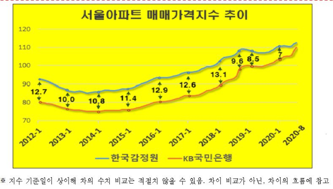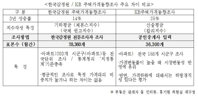 그러나 정부가 한국감정원의 주택가격동향지수가 국민이 체감하는 시장과의 괴리감이 있는 점은 인정하고 향후 통계지수 발표시 KB국민은행의 주택가격동향지수 등을 함께 발표해 시장과의 괴리감을 줄이기 위한 노력을 병행해야 한다고 강조했다.