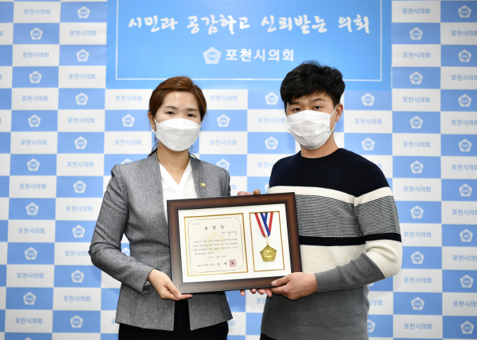[포천=쿠키뉴스 윤형기 기자] 경기 포천시의회는 15일 의장실에서 그동안 지역사회 발전과 주민복지를 위해 헌신한 청년 시민에게 표창장을 수여했다.