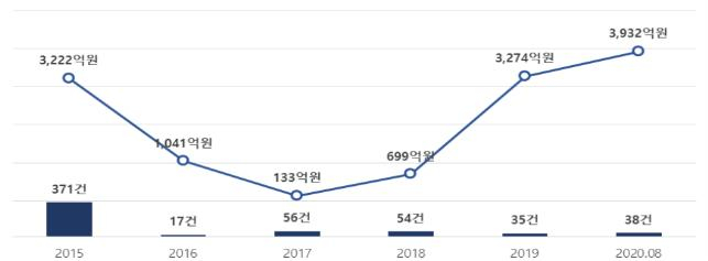 먼저 ‘주택분양보증’ 사고는 2017년, 2018년 사고 발생 0건에 불과하였으나, 2019년 1건(2022억원), 2020년 8건(1806억원) 발생했다.