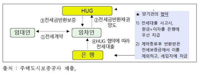 안심전세대출 제도는 HUG가 임차인에게는 전세금 반환 책임(전세보증금반환보증)을, 은행에는 전세대출 원리금 상환(전세자금대출보증)을 함께 책임지는 전세금융상품이다. 세입자는 일부 보증료를 부담하면 보증금 반환 위험 해소는 물론, 전세대출도 저리로 조달할 수 있다.