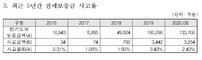 만기도래 보증금액 대비 사고금액을 나타내는 전세보증금 반환보증 사고율도 2016년 0.31%에서 2019년에는 3.43%로 11배나 높아졌다.
