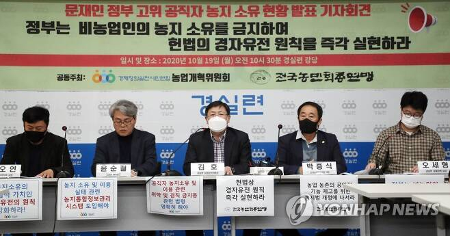 한편 박흥식 전국농민회총연맹 의장도 이날 농지는 투기의 대상이 아니며 비농업인의 농지를 처분해 안전한 먹거리를 생산하는 농민에게 갈 수 있게끔 사회가 나아가야 한다고 주장했다.