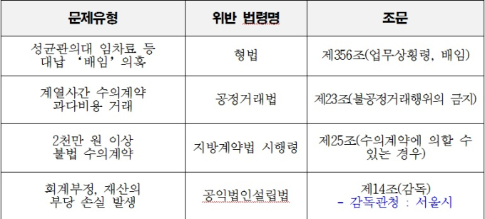삼성서울병원이 위반한 성균관 의대의 임차료와 인테리어 비용을 대납한 사항에 대해서는 형법 상 ‘업무상 배임’에 해당하며, 계열사 수의 계약으로 수천억원을 거래한 사항에 대해서는 공정거래법 상 ‘불공정거래행위 금지’에 해당한다. 그리고 2천만원 이상 수 건의 불법 수의계약에 대해서는 지방계약법 시행령 위반에 속하며, 회계부정과 부당손실을 발생시킨 혐의는 공익법인설립법 위반이다.