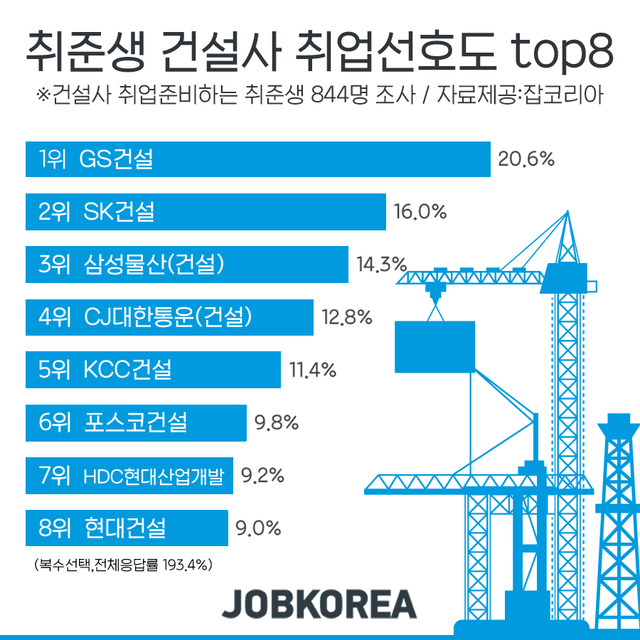 취업 플랫폼 잡코리아는 건설사 취업을 준비하는 취업준비생 844명에게 ‘가장 취업하고 싶은 건설회사’를 질문한 결과 이같이 나타났다고 28일 밝혔다. 이번 조사는 2019 시공능력평가 순위 상위 50개사를 보기문항으로 조사했다.