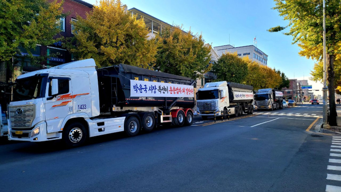 석탄화력발전소 석탄운송을 담당하는 운송업체들은 29일 집회신고를 내고 이날 오전 8시부터 덤프트럭 9대를 이용해 시청 앞을 다니며 시위를 벌였다. 차량에는 '박윤국 시장의 독선이 운송업자 피 말린다' '박윤국 시장은 운송업자 생계를 책임져라' 등의 구호가 적힌 현수막을 내걸었다.