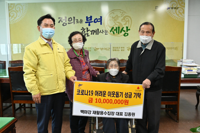 [부여=쿠키뉴스] 오명규 기자 =부여군 기부천사로 잘 알려진 백마강 재활용수집장 김종원 대표는 지난 10월 29일 밀알장학회 민순덕 회장과 함께 부여군청을 방문하여 코로나19로 어려운 가정을 지원해 달라며 이웃돕기 성금 1,000만원을 기탁했다.