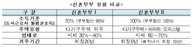 신혼부부 매입임대주택은 다가구 주택 등에서 시세 30~40% 수준으로 거주할 수 있는 Ⅰ유형(1,626호)과 아파트‧오피스텔 등에서 시세 60~70%로 거주할 수 있는 Ⅱ유형(1,724호)이 공급되며, 신청자들은 본인의 상황에 맞는 유형을 선택해 신청하면 된다.