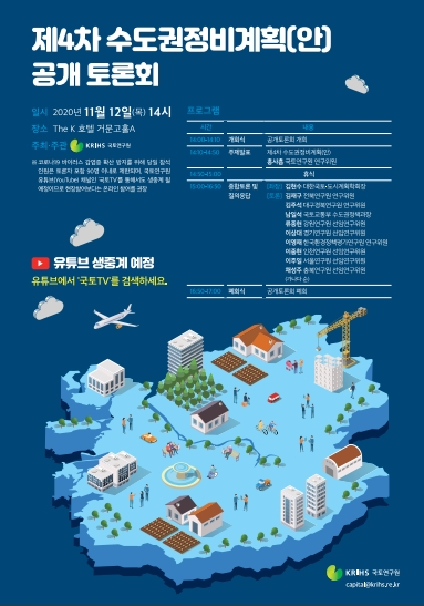 국토연구원에 따르면 이날 토론회에서는 제4차 수도권정비계획 수립 연구용역 책임자인 홍사흠 연구위원이 ‘제4차 수도권정비계획(안)’에 대해 발표에 나설 예정이다.