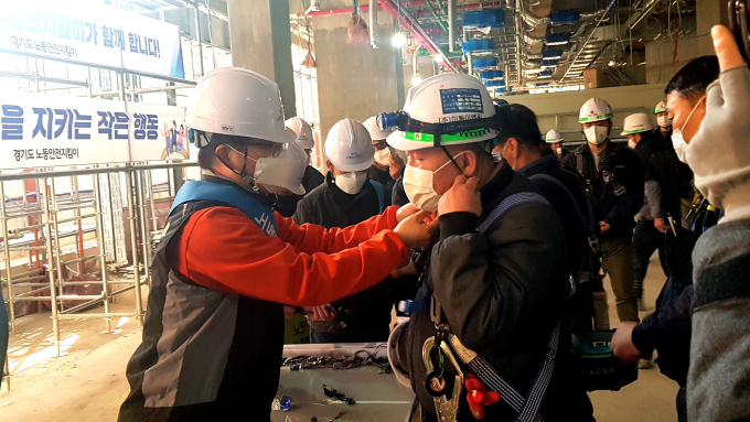 [의정부=쿠키뉴스 윤형기 기자] 경기도는 11일 부천 건설현장에서 노동안전지킴이와 '안전모 착용 의무화 캠페인'을 벌였다.