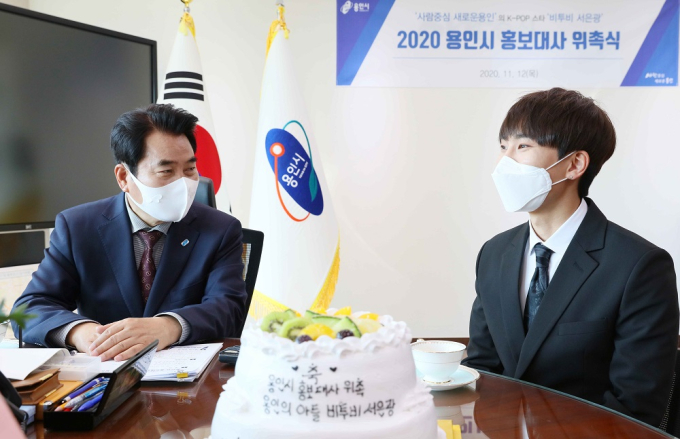 [용인=쿠키뉴스 박진영 기자] 경기도 용인시는 12일 시장실에서 지역 출신 가수 서은광(그룹 비투비 리더)씨에게 시 홍보대사 위촉장을 전달했다.